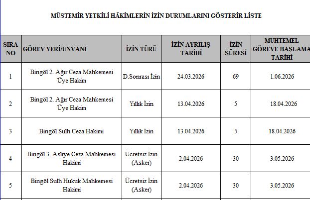 MÜSTEMİR YETKİLİ HÂKİMLERİN İZİN DURUMLARINI GÖSTERİR LİSTE 14.04.2026